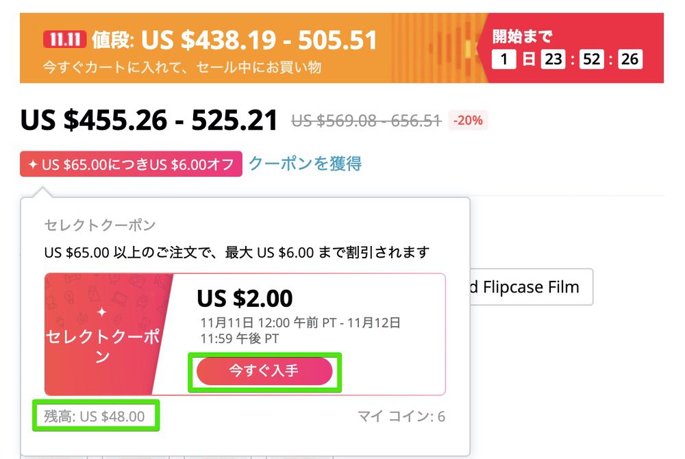 AliExpressのセール価格が安い場合はAliExpressで購入するとOKなんですが、多くの製品がセール開始時点で製品ページに表示されるクーポンを適用しての価格となります。セール開始直後にモタモタしていると限定数はあっという間になくなってしまいます。