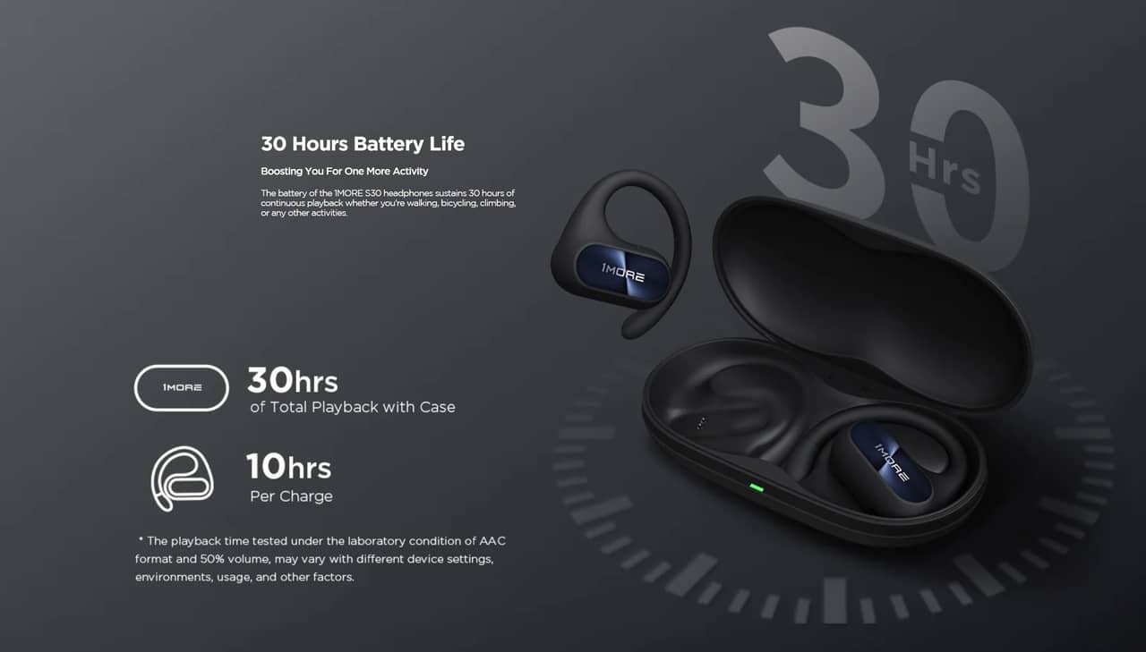 1MORE Fit SE S30は公表値でイヤホン単体だとバッテリー持ちは10時間とのことで、実際に長時間音楽を流して検証した結果、音量50%なら約10時間持つ感じ…!
