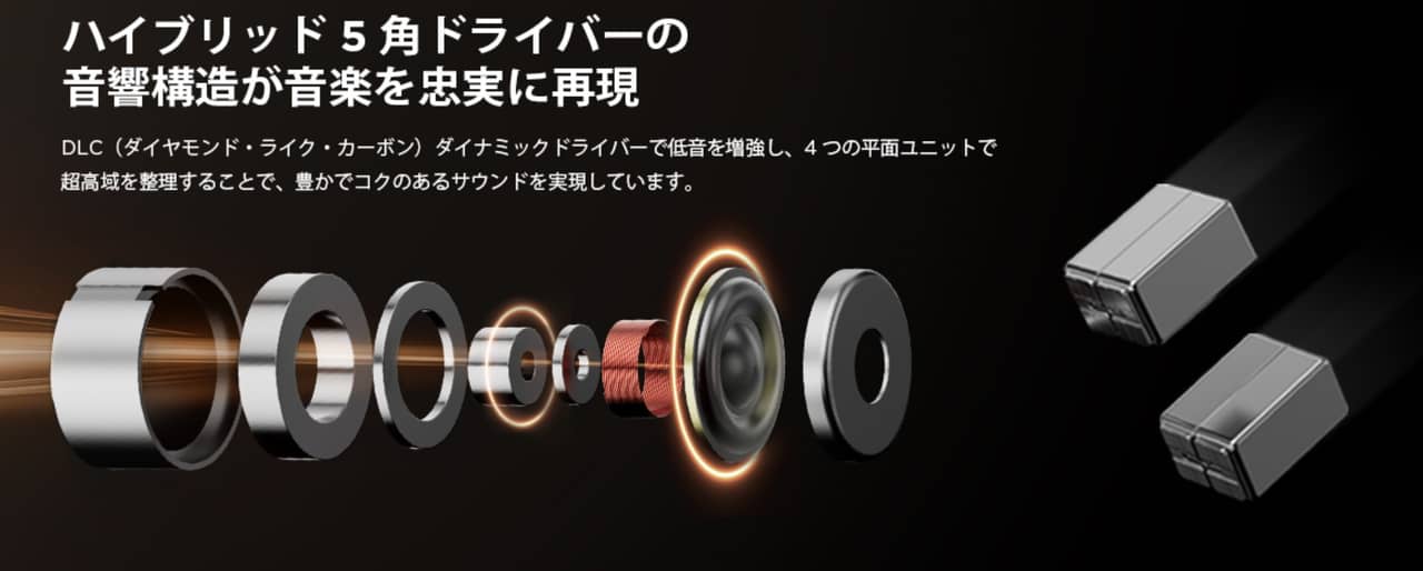 ▼1MORE ペンタドライバー P50はDLC+4平面振動板からなるペンタドライバー構造となっており、低音、中音、高音ともに正確に奏でてくれるんだそう。↓