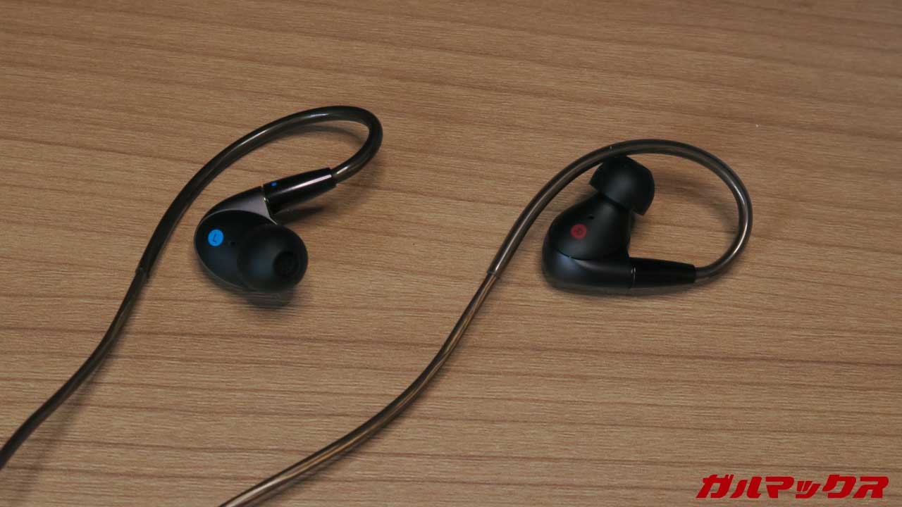 ▼このイヤホン、「耳にケーブルをかけるタイプ」なので普通のイヤホンとはちょっと装着方法が異なります。そのため耳へのフィット感と外れにくさが魅力。↓