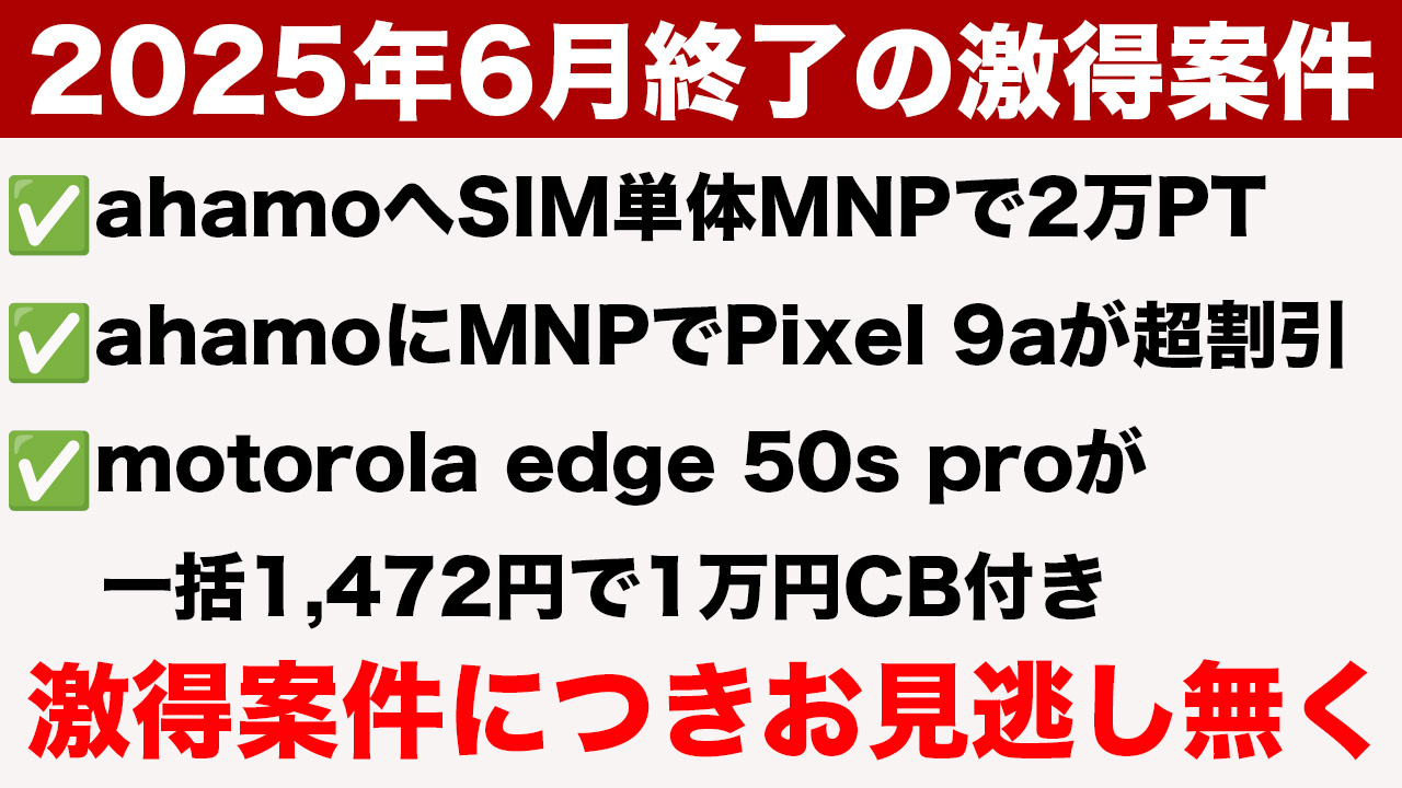6月末で終了予定のスマホ・SIM案件です。基本的にMNPが条件ですがかなり安い&お得なのでタイミングが合う方はどうぞ。ahamoのSIM単体申し込み2万pt、iPhoneやPixel 9aの5GWELCOME割増額、モトローラのedge 50s proの1万円CBなど。