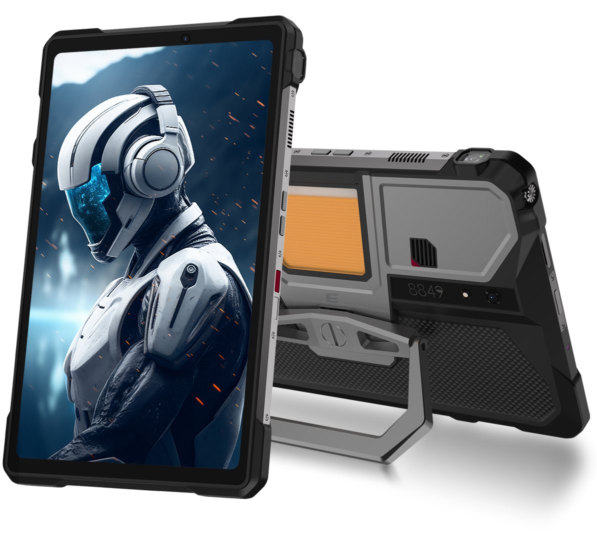 8849 TANK Pad Eのデザイン、タフネスらしい非常にイカつい形状。デザイン的にはこれまでもリリースしてきたTankスマホと同じ系譜。シルバーとブラック、加えてカーボン調デザインが絡み合う複雑な形状は他にはないオーラを放ちます。カラーはシルバーの1色のみ。