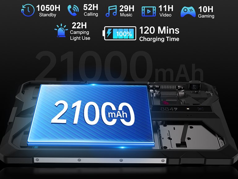 バッテリー容量は驚異的な21,000mAh!スマホの平均(5,000mAh)の4台分、他のタブレットでも2~3台分と考えればその異様な大きさがわかるでしょう。