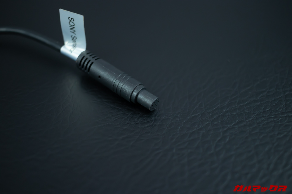 ▼そしてこれは「GoSafe S36GS1」「GoSafe M790S1」「GoSafe S70GS1」のリアカメラからニョキッと伸びてるケーブル先端。こんな感じでカメラから伸びるケーブルが独自の端子となってまして、通常であればこの先に(リアカメラ搭載モデルに)付属している長い車外取り付け用ケーブルを接続するんですが、なんせ車外用はケーブルが4Mくらいあるので車内カメラ用として使うのは長すぎて不向き。そこでA-GS-G34の出番ってわけです。↓