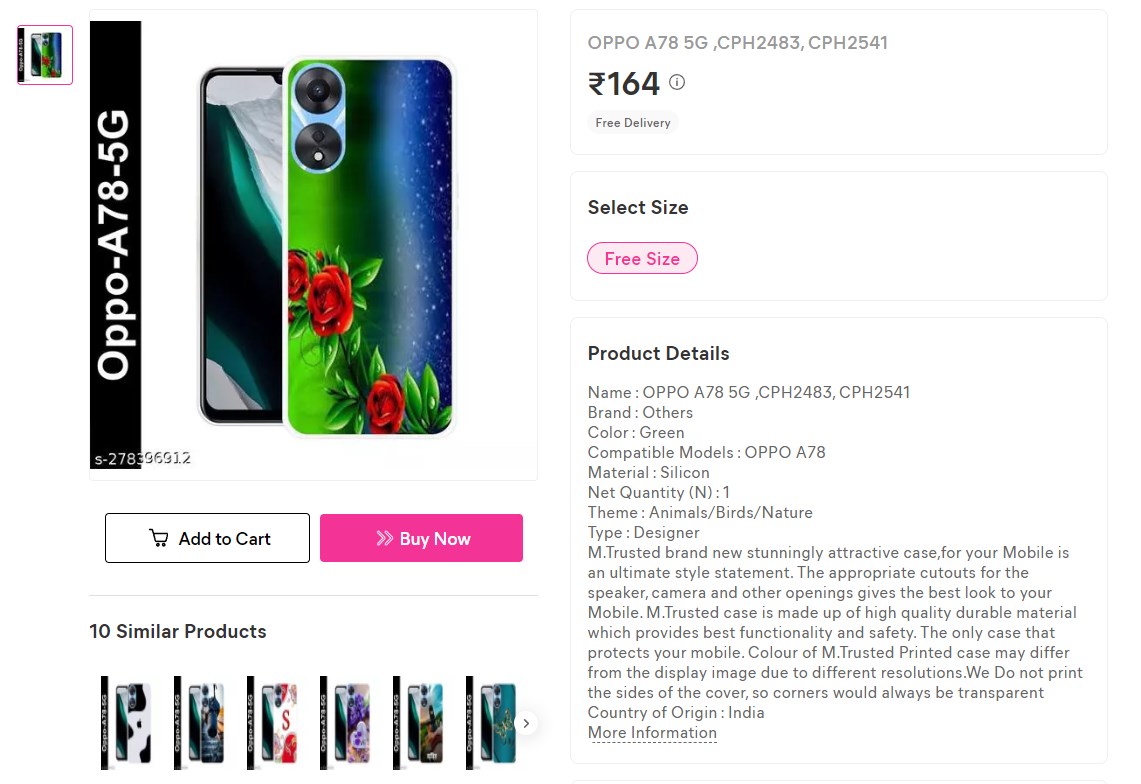 ▼ただ一つだけ興味深い検索結果が出てきてまして、Meeshoっていう海外の通販サイトが引っかかりました。スマホケースのページみたい。↓