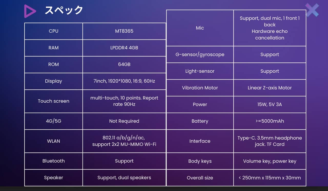 ▼スペックを確認してみるとCPUにMT8365、メモリは4GB、容量64GBとエントリースマートフォンのような構成です。↓