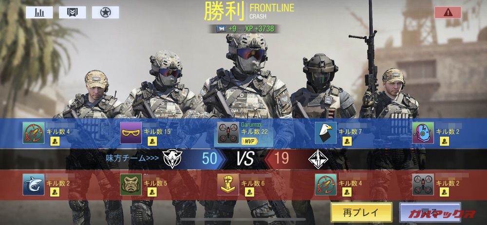 ▼プチフリ起こしながら必死で戦って22キル。結構倒せたんですが、通知センター誤爆のプチフリがなければもっと良い成績を残せたかと思うと悔しい。↓