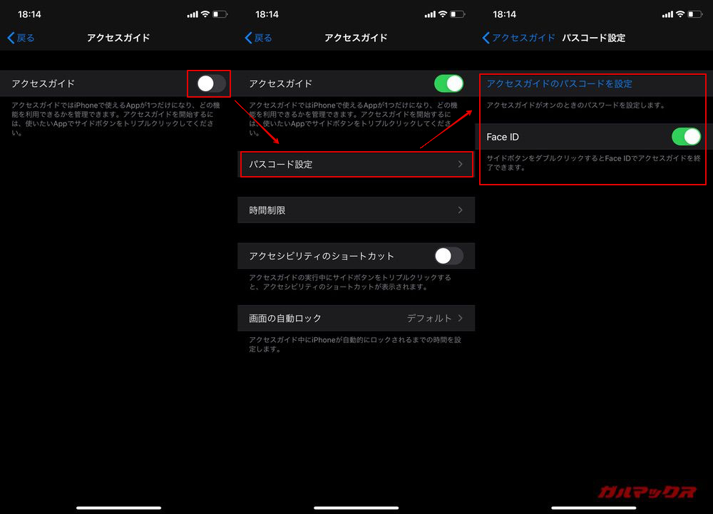 ▼アクセスガイドのスイッチをタップしてオン!続いて「パスコード設定をタップしてパスコードを設定しよう!Face ID搭載端末の場合はFace IDのスイッチもオンにしておこう!↓
