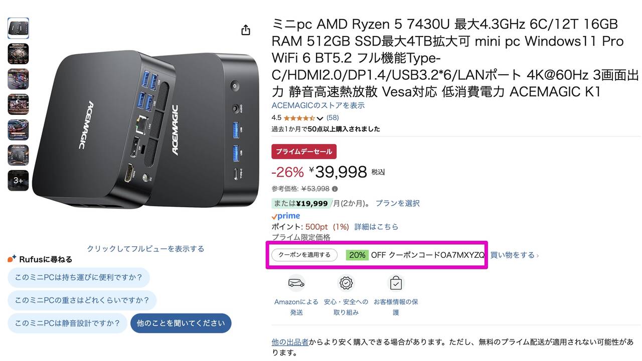 ACEMAGICのミドルレンジミニPC「ACEMAGIC K1」がAmazonプライムセール中にクーポン適用でかなりお安くなる!との情報をゲットしたので紹介していきます!期間は7月11日から7月14日までの短期間なのでお見逃しなく!