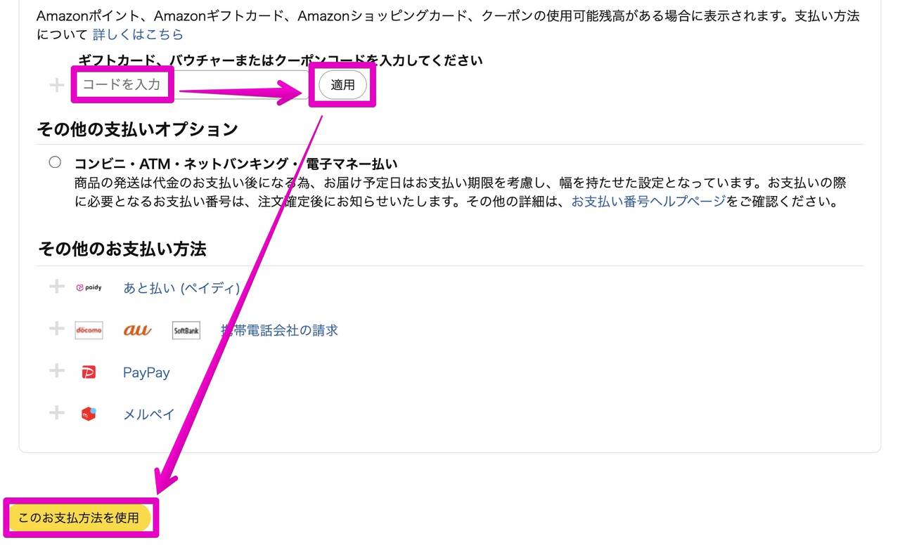 ▼レジ画面の「ギフトカード、商品券、プロモーションコードを使用する」を開いて以下に「34V3MZP2」を入力して「適用」をクリック、最後に「このお支払い方法を使用」をクリックして下さい。↓