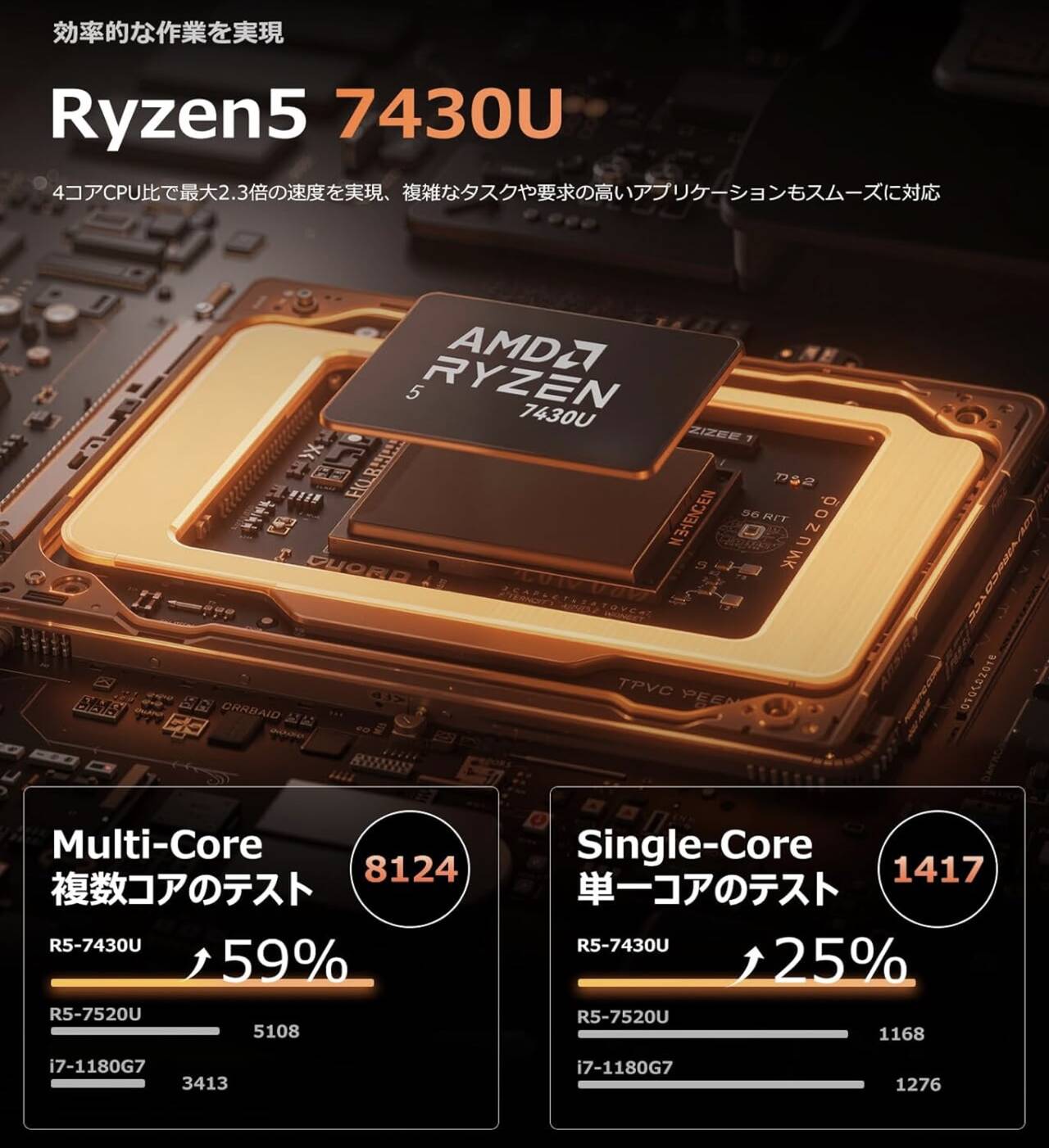 ▼搭載するCPUはAMD Ryzen 5 7430Uを搭載!↓