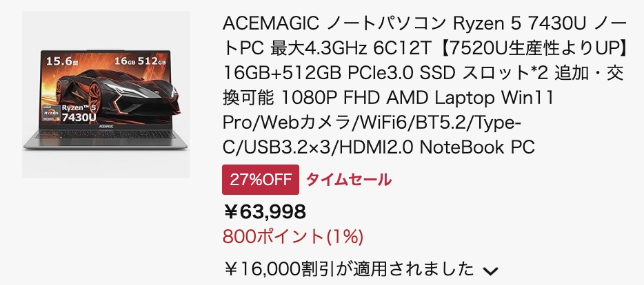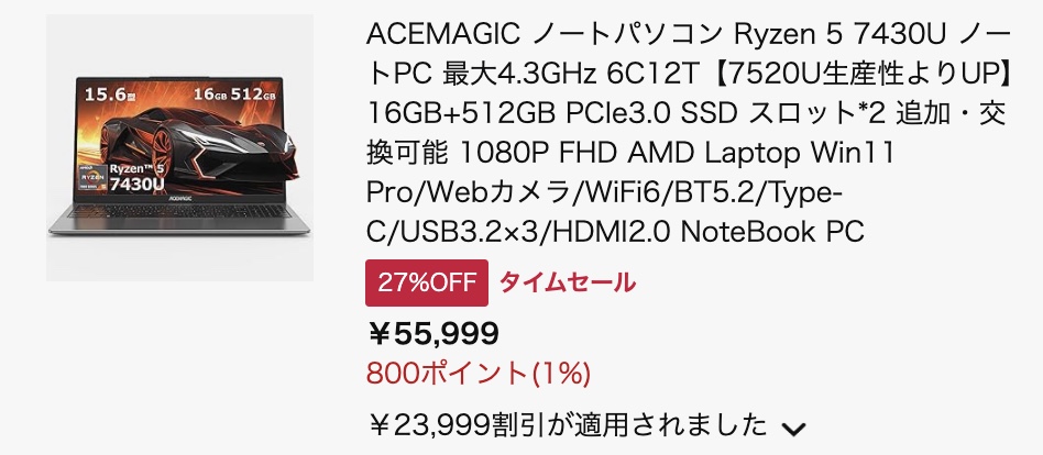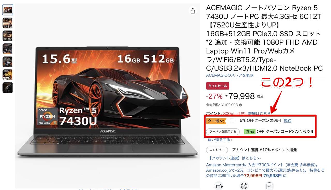 執筆時点でACEMAGIC LX15ProはAmazonタイムセールで79,998円だが、秘密のクーポンを適用すると最終価格55,999円!8月11日までの短期割引なのでお見逃し無く。