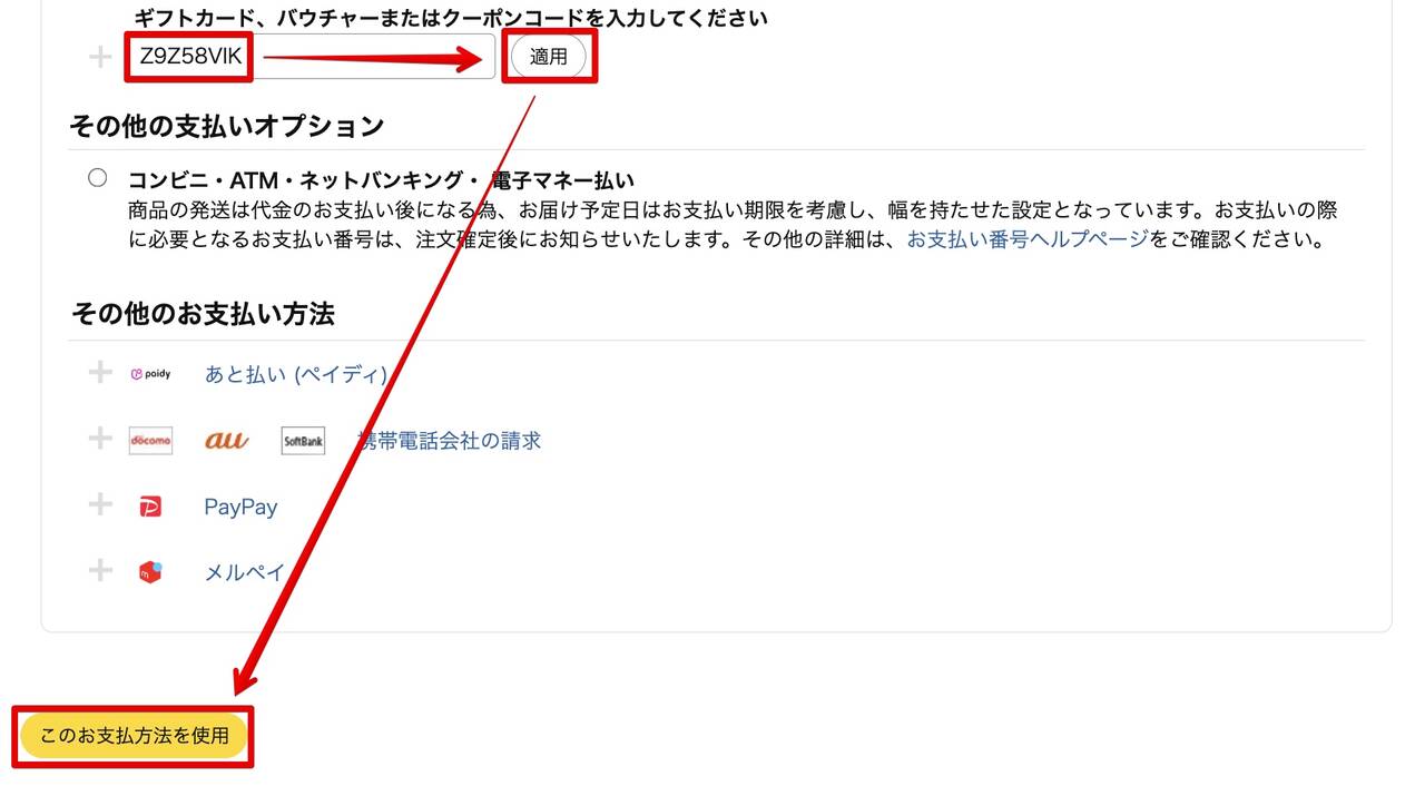 ▼レジ画面に「ギフトカード、商品券、プロモーションコードを使用する」というリンクがあるので入り、クーポン「Z9Z58VIK」を入力。その後「適用」を押して最後に「このお支払方法を使用」をクリックしよう。↓