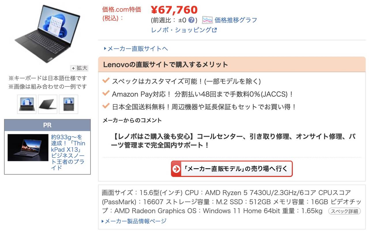 ▼いつもお世話になっている価格.comで似たようなスペックのモデルを探したところ、Lenovo V15 Gen4というモデルが最安で67,760円。↓