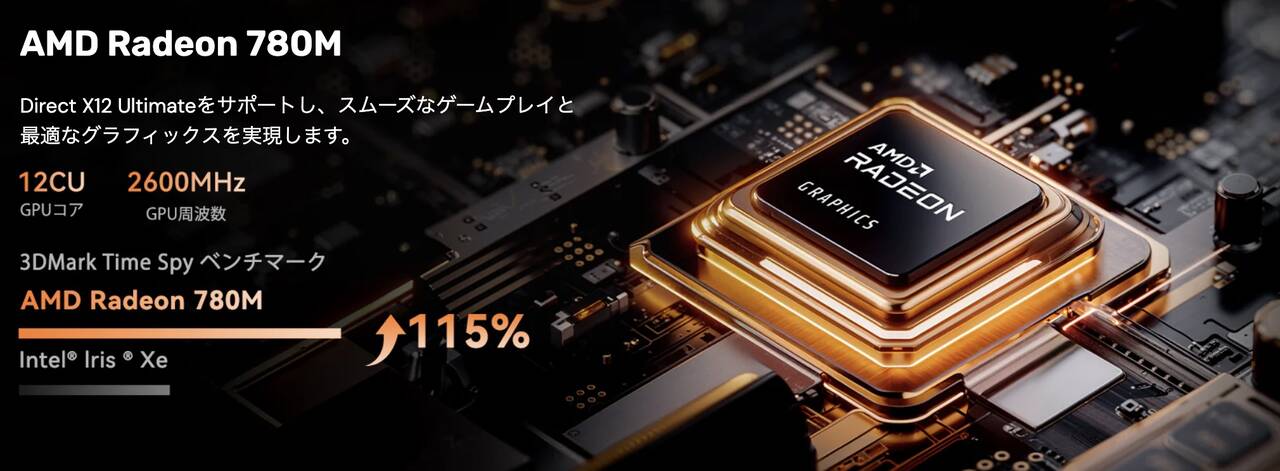 ▼GPUはオンボードだが、これも凄い。搭載しているGPUはRadeon 780MでオンボードGPUとしては超ハイスペ。APEXもFHDで60FPSくらいで遊べるほどパワフル。↓