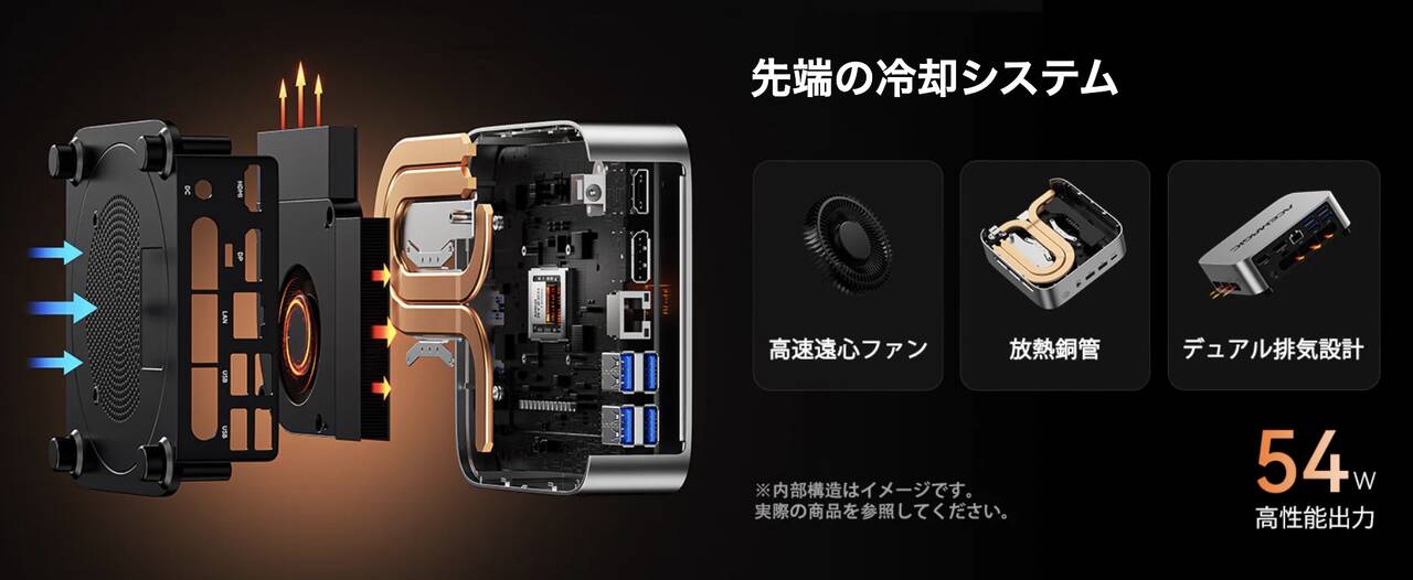 ▼コンパクトな筐体なので排熱性能が気になるが、以下の通り内蔵ファン&デュアル排気機構を搭載することで効率的な熱排気ができるよう設計されている。↓