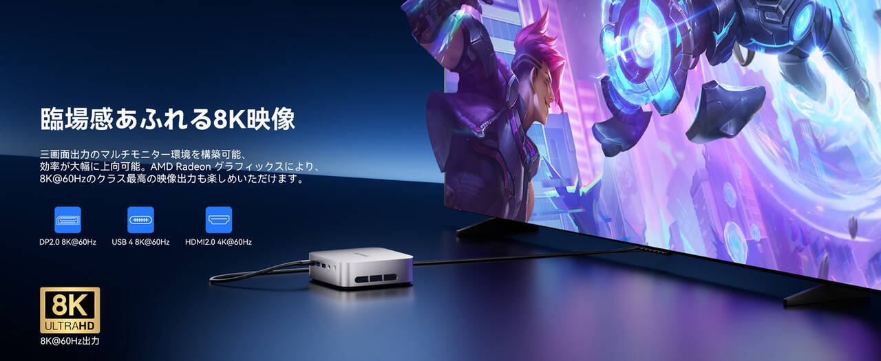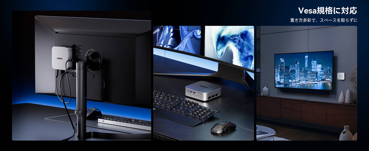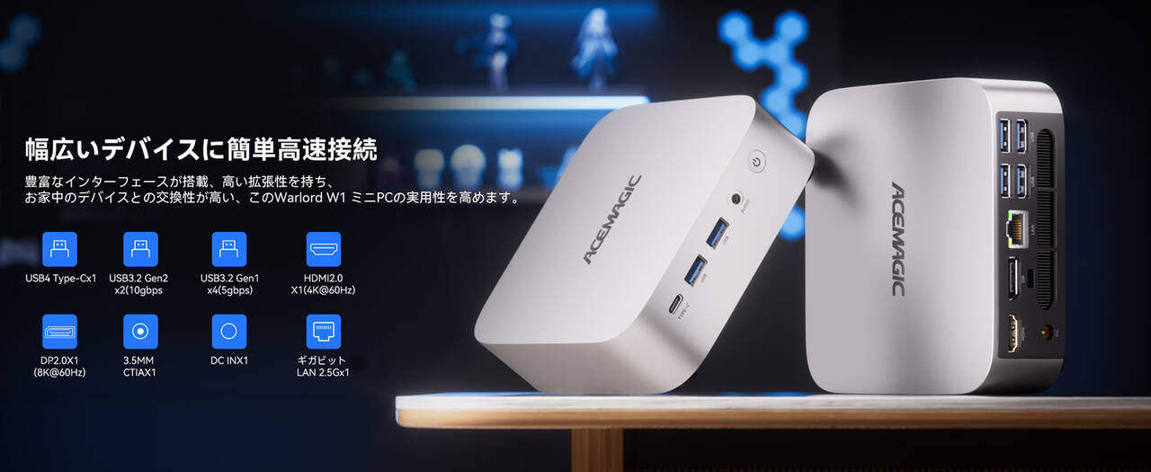 | インターフェース | 10M/100M/1000M/2.5Gbps RJ45ギガビットイーサネットポート×1 USB3.2 Gen2 Type-A×2 (前) USB3.2 Gen1 Type-A×4 USB4 Type-C×1 (DP1.4、8K@60Hz、最大40Gbit/sのデータ転送、PD出力をサポート) DC IN ジャック×1 HDMI2.0×1 (4K@60Hz) DP2.0×1 (8K@60Hz) 3.5mmオーディオジャック×1 スイッチ×1 |