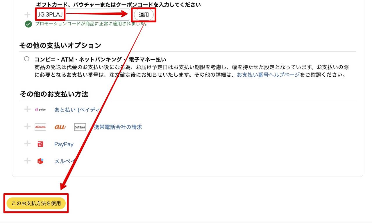 ▼続いてレジ画面に「ギフトカード、商品券、プロモーションコードを使用する」というリンクがあるのでクリック。以下の通り秘密のクーポン「JGI3PLAJ」を入力、続いて「適用」、最後に「このお支払い方法を使用」をクリックしよう。↓