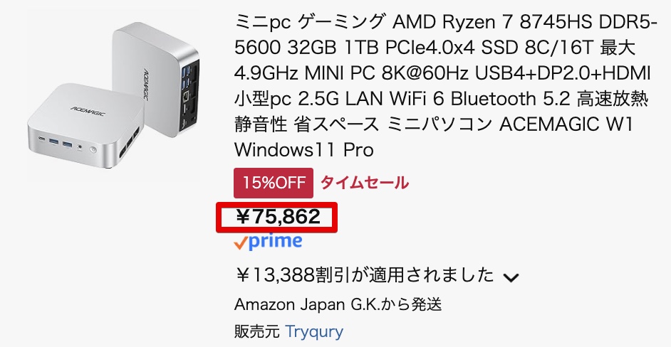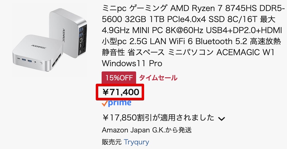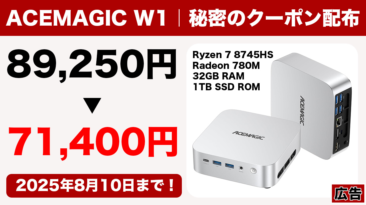 いまAmazonでRyzen 7 8745HSを搭載するミニPC「ACEMAGIC W1」がタイムセールで89,250円となっているが、秘密のクーポンを適用すると・・・なんと71,400円になるぞ!8月10日まで。