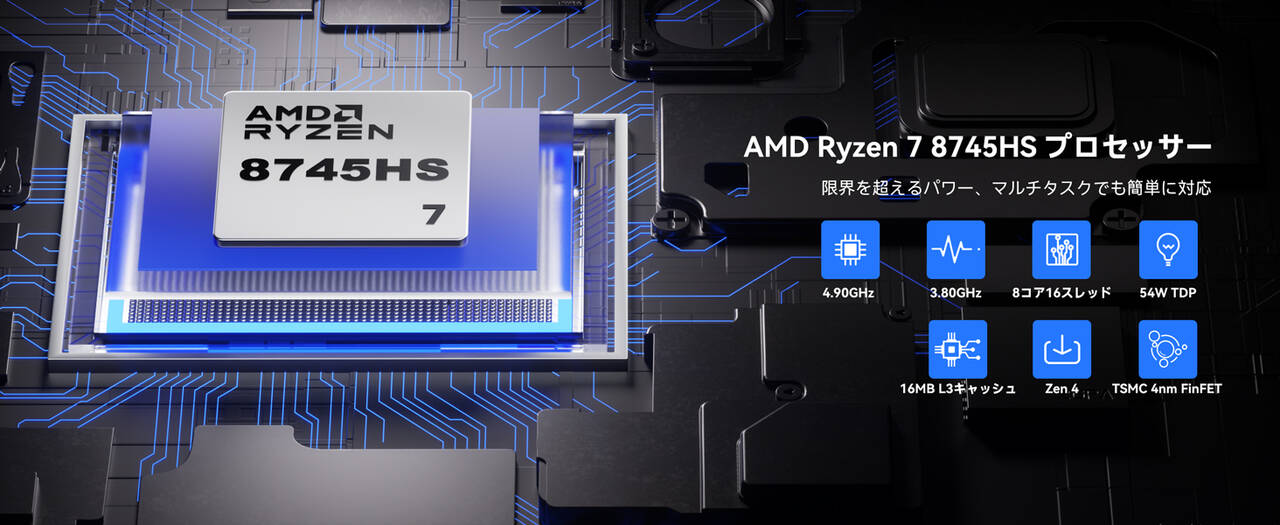 ▼搭載するCPUはAMD Ryzen 7 8745HS。8845HSから少しクロックを落としてAI機能をカットしているCPUだが、性能が非常に高い。↓