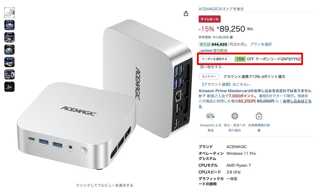 で、執筆時点だとタイムセールで89,250円とお安くなっている。いまは誰でも使える15%オフクーポンがあるので、適用すると75,862円。