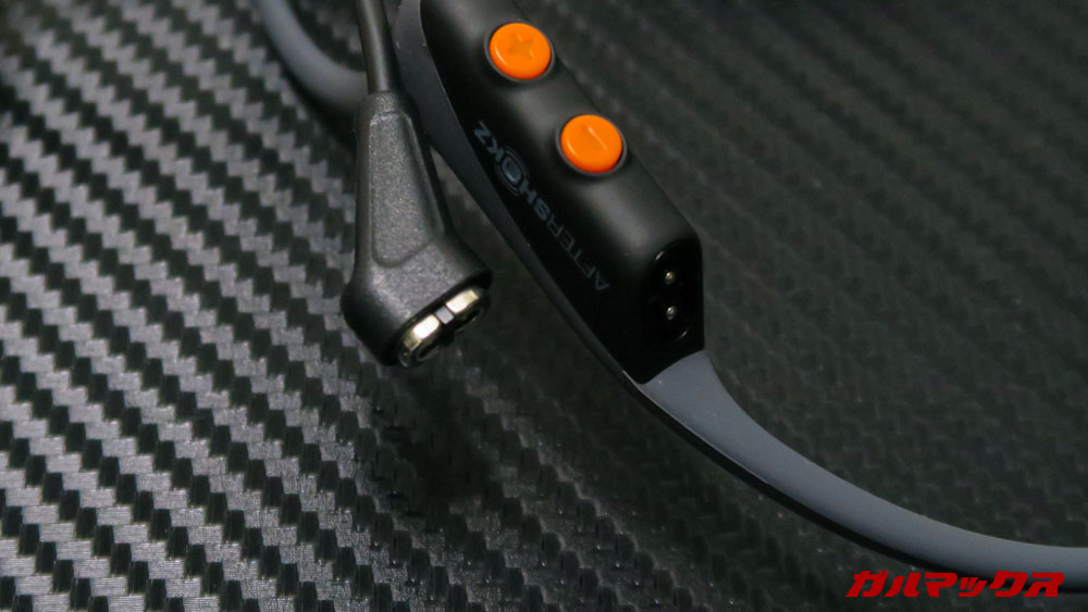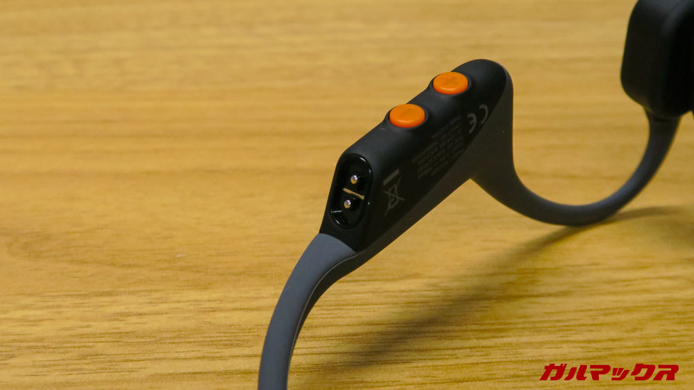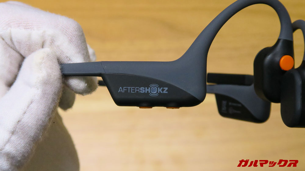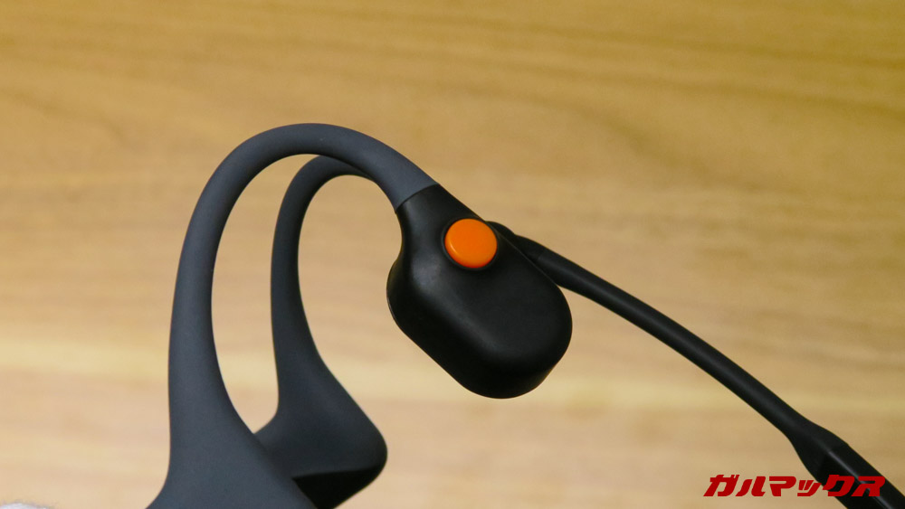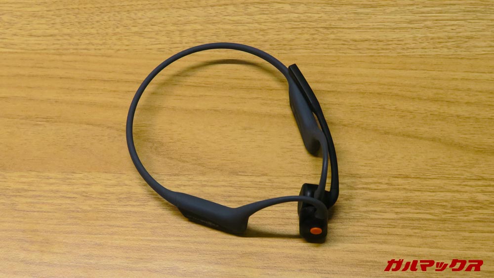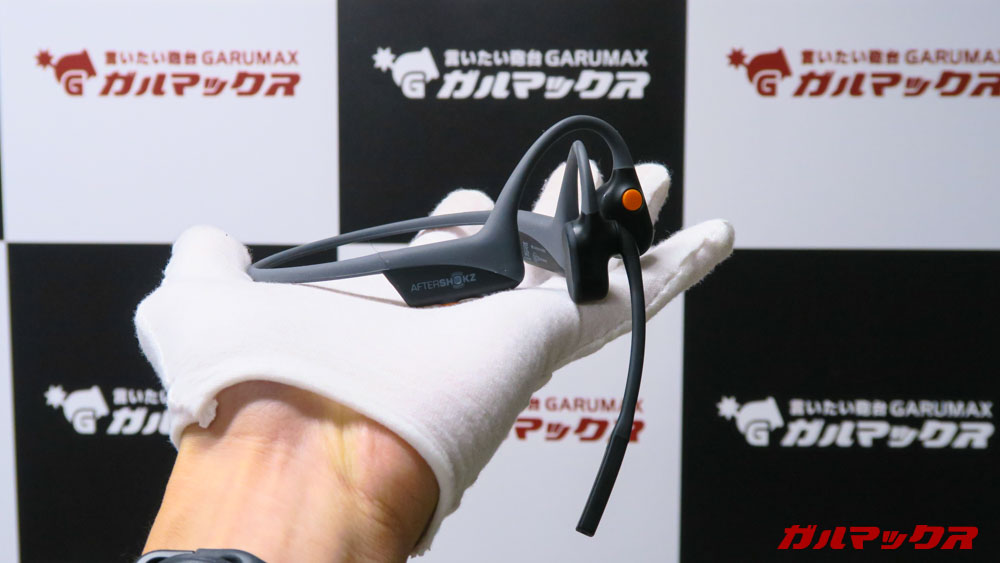 ▼AfterShokz OpenComm、仕事メインというコンセンプトゆえに外観は地味なのかなーって思ってましたがそんなことはありません。操作ボタンにアクセントカラーのオレンジがあるおかげで結構カッコいい!カラーはスレートグレー。↓