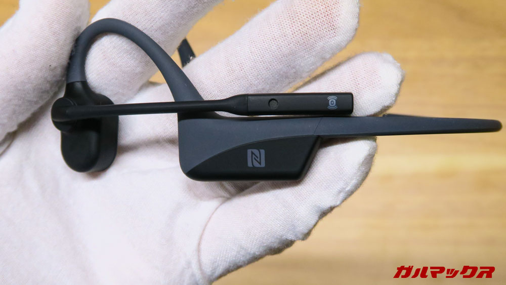 ▼AfterShokz OpenCommはNFCペアリング接続ができるモデル!左耳のバッテリー部分にNFCチップが埋め込まれているのが特徴です。ペアリング中にスマホのNFCにくっつければサクっとペアリング完了!楽ちん!↓