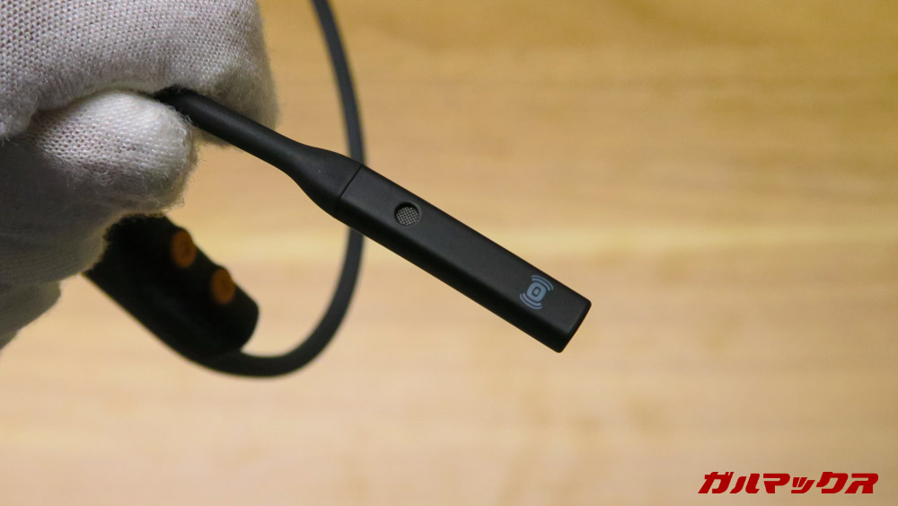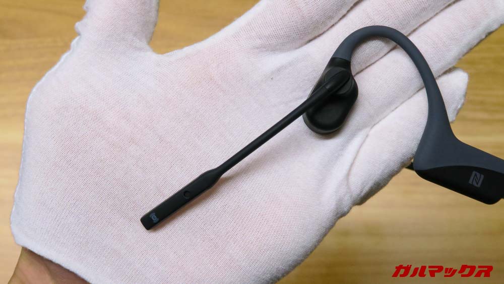▼AfterShokz OpenCommのキモであるブームマイク。このマイクはデュアルマイクとなっておりノイズキャンセリングに対応しているっていう結構凄いマイクなんすよ。↓