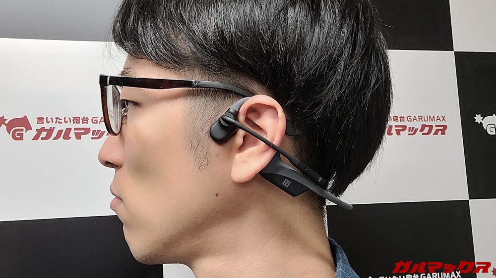 骨伝導タイプなので普通のイヤホンとは装着感はまったく違います。耳より少し前のナントカ骨に当てる装着方式なので、最初装着した時は若干ながら違和感は出てきました。