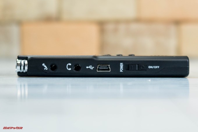 ▼本体左側面にはマイク端子、イヤホン端子、充電端子、スライド式の電源スイッチが備わっています。↓