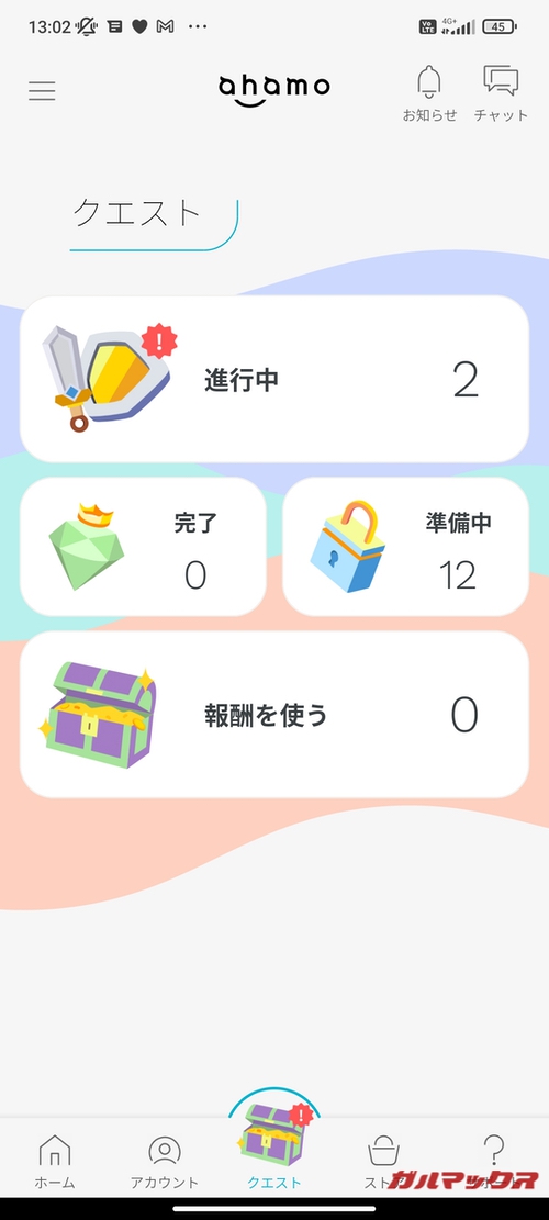 ▼ahaクエストの画面では「進行中」「完了」「準備中」「報酬を使う」に分かれてます!↓