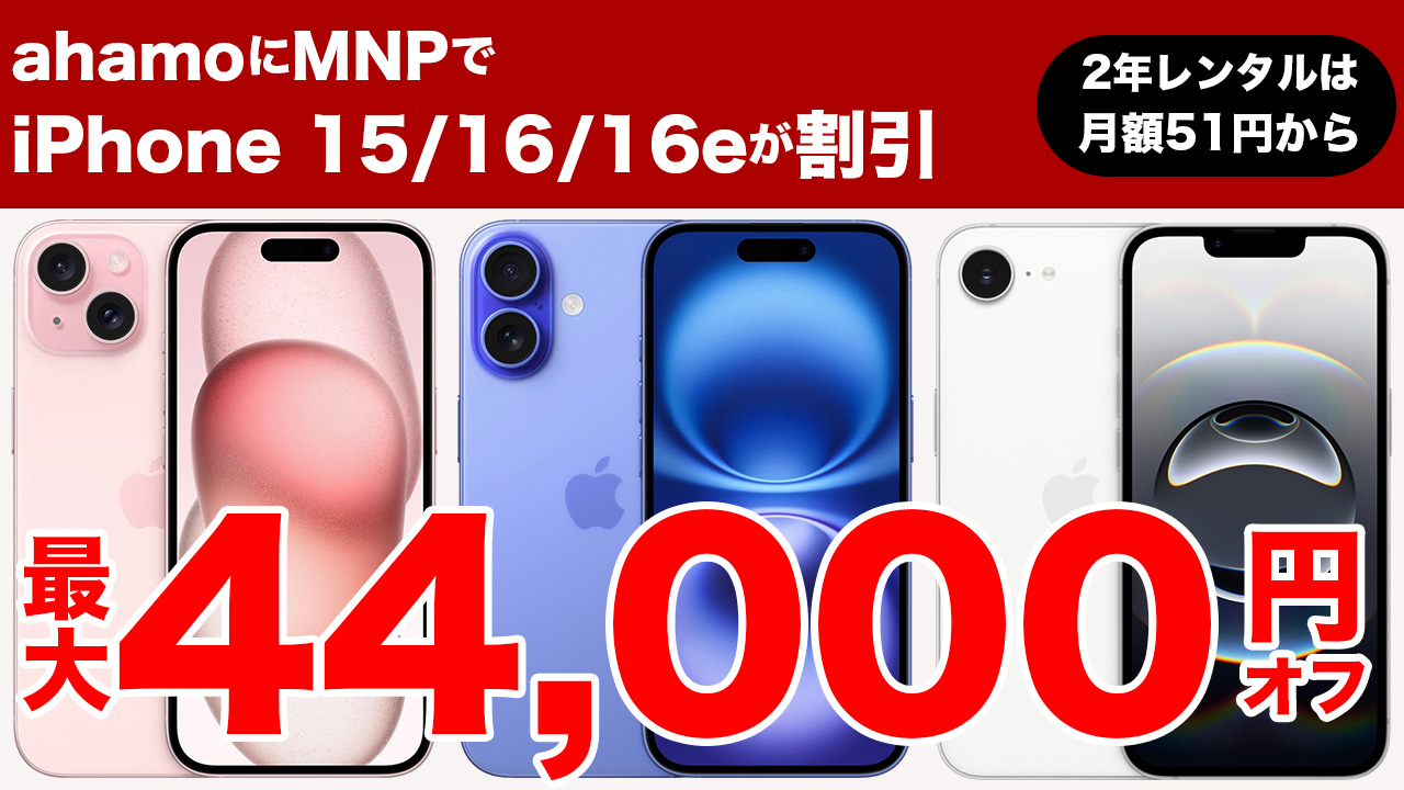 ahamoにMNPでiPhone 15 / iPhone 16 / iPhone 16eが最大4.4万円オフ!2年レンタルは月額51円から