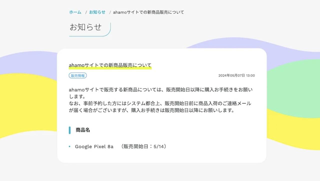 docomoのahamoでPixel 8aの販売開始日が一時的に掲載。5月14日らしい。それにしても最近公式お漏らし多いな…。ちなみに既に上記のお知らせからは削除済み。