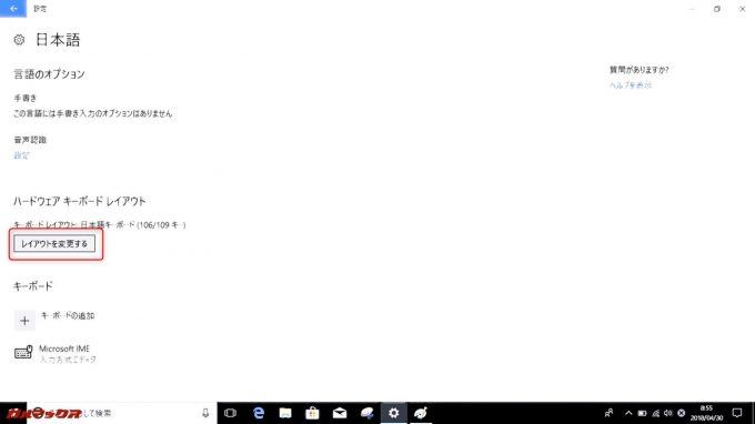 「ハードウェアキーボードレイアウト」から「レイアウトを変更する」をクリック↓