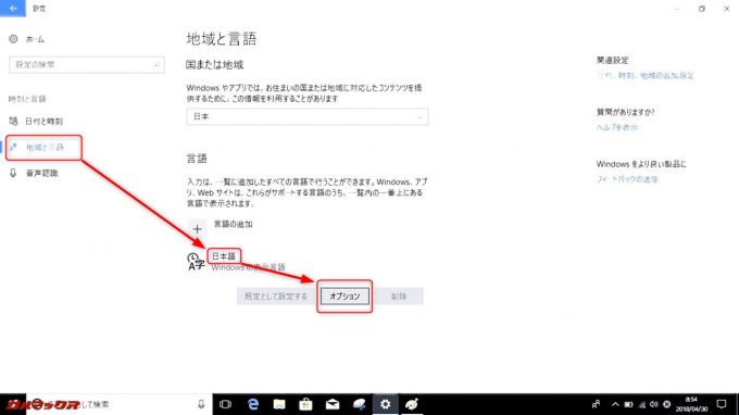 ▼左側タブの「地域と言語」を選び、右の「言語」から「日本語」をクリック。そこから「オプション」をクリック↓