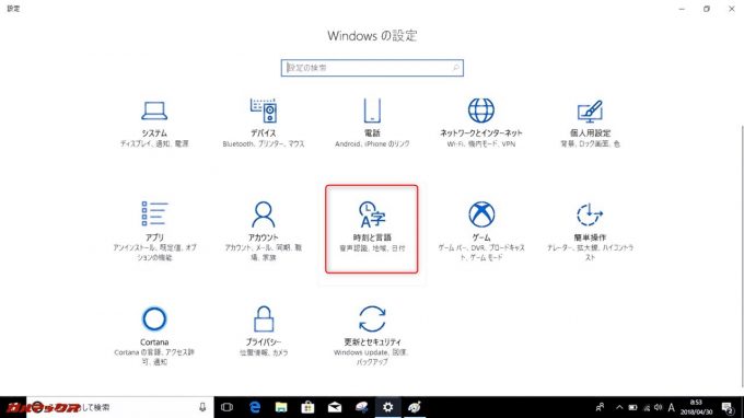 ▼まずは設定画面を開いて「時刻と言語」をクリック↓
