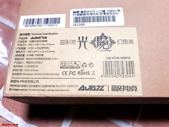 ▼裏には中国語で簡単なスペックが表記されています。↓