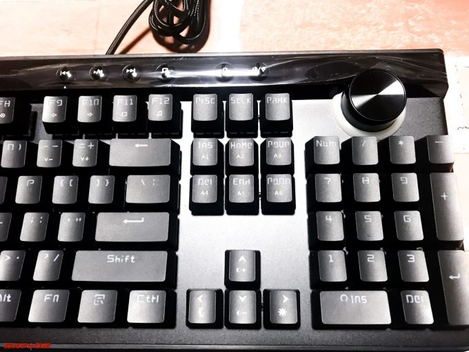 104鍵のUS配列キーボードで、さらにショートカットキーが7鍵の合計111鍵のキーとなります。重量は1230gと少しずっしりとくる重さ。この辺りは安定感とのトレードオフになりますね。
