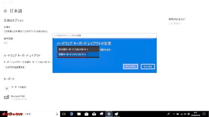 ▼プルダウンから「英語キーボード(101/102キー)」を選び、「サインアウト」をクリック↓
