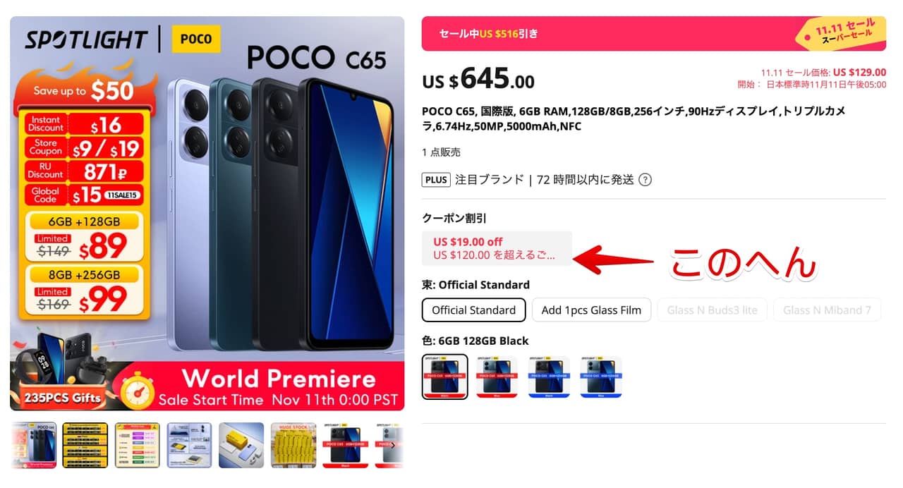 ▼11月11日発売のPOCO C65。149ドルの新製品がいきなり89ドルという理解不能な割引を実施。↓