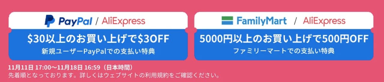 お買い物時に支払いをPayPalかファミマ支払いを選ぶだけで割り引かれるキャンペーンもやってます。これ、11月11日〜11月18日16時59分までで先着順となってるので、これも割り引かれたらラッキー程度に。