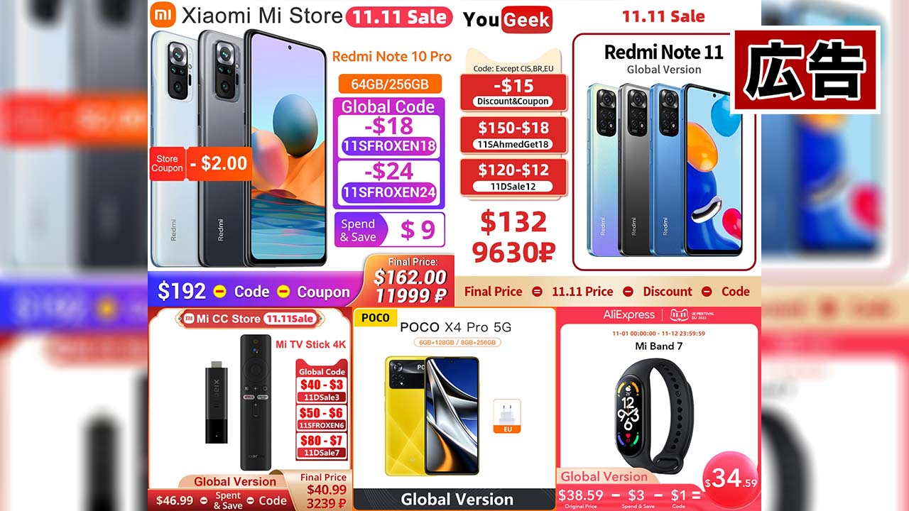 AliExpressの1111セールでミドルレンジスマホとアクセサリが安くなっていますよ!スマートバンドのMi Smart Band 7やRedmi Note 11など各種製品がお買い得。1111セールももう終わりなのでお見逃しなく!