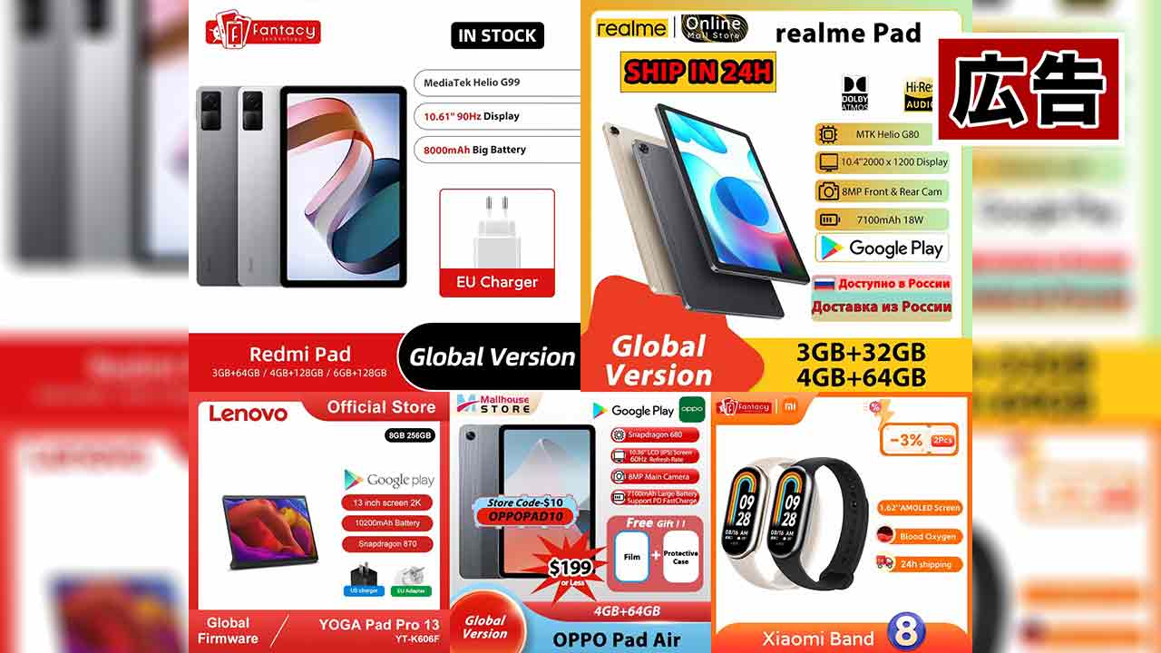 Redmi・realme・Lenovo・OPPOのAndroidタブレットがAliExpressでセール中ですよ!さらにスマートバンドのXiaomi Mi Band 8も対象です。