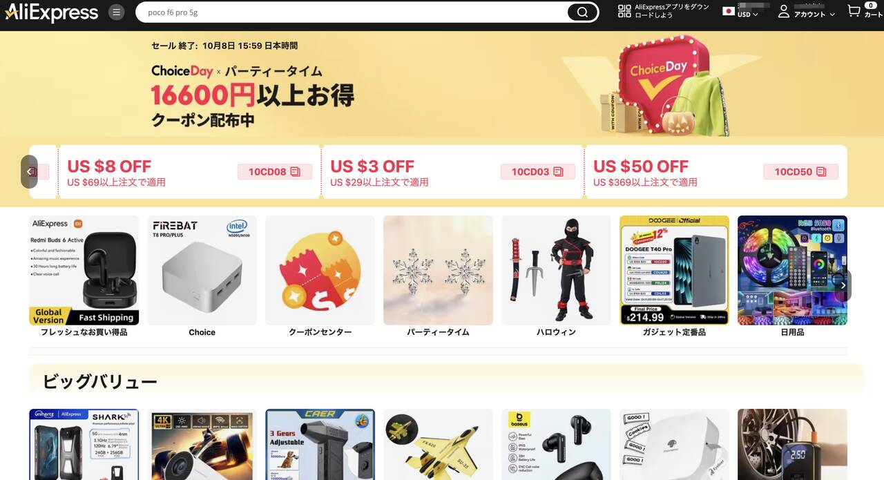 AliExpressで10月8日までChoice Day開催!購入前にクーポンを適用をお忘れなく