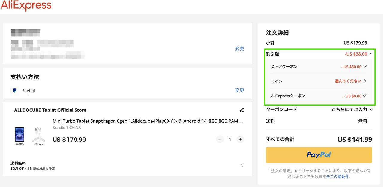 ▼ためしに10月3日まで初売りセールで179.99ドル→149.99ドルとなっているALLDOCUBE iPlay 60 mini Turboに上記の8ドルオフクーポンを適用してみたら割り引かれて141.99ドルになりました!↓