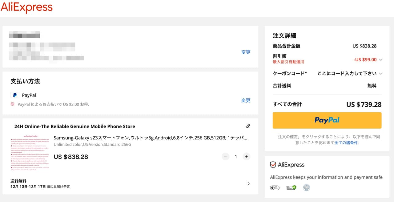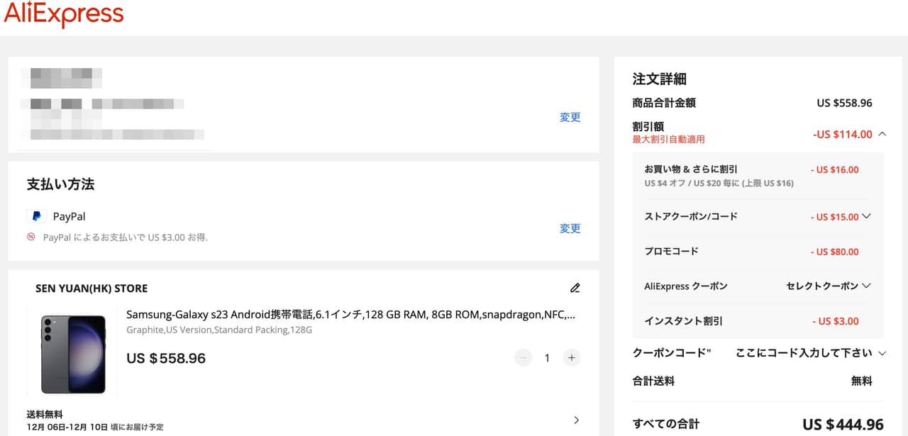 ▼[AliExpress]販売ページでそのままカートに入れてレジに進み、①→②の順でクーポンを2つ適用すると444.96ドル(約6.7万円!)↓