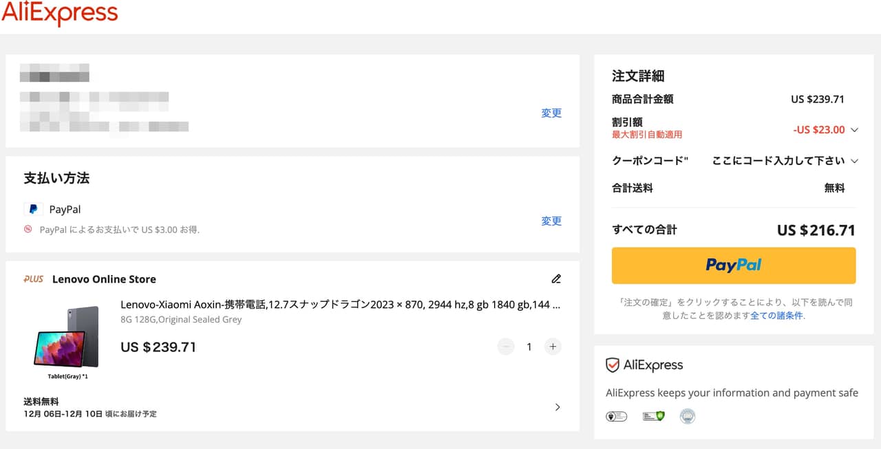 ▼[AliExpress]セール価格からレジで自動割引にて216.71ドル(約3.2万円!)↓