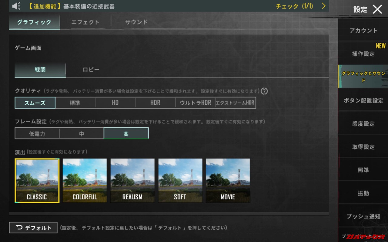 ▼続いては軽めの3DゲームとしてPUBGモバイルを試します。フレーム重視の設定ではスムーズ+高(上限30FPS)までOK。↓