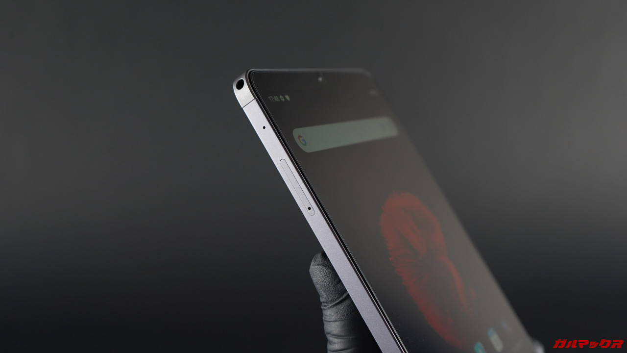 ▼左側面はSIMトレイ(NanoSIM×2またはNanoSIM×1+microSD)にイヤホンジャック。↓