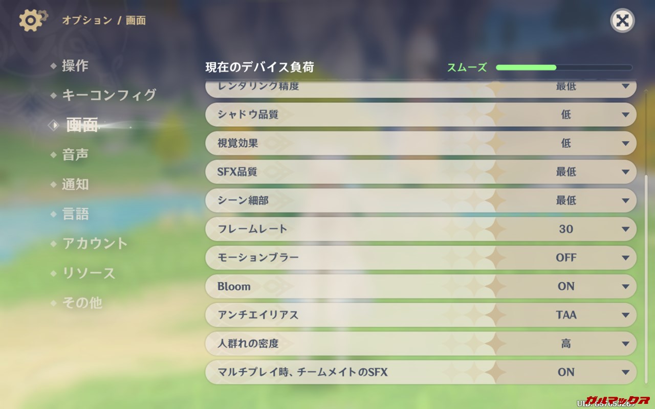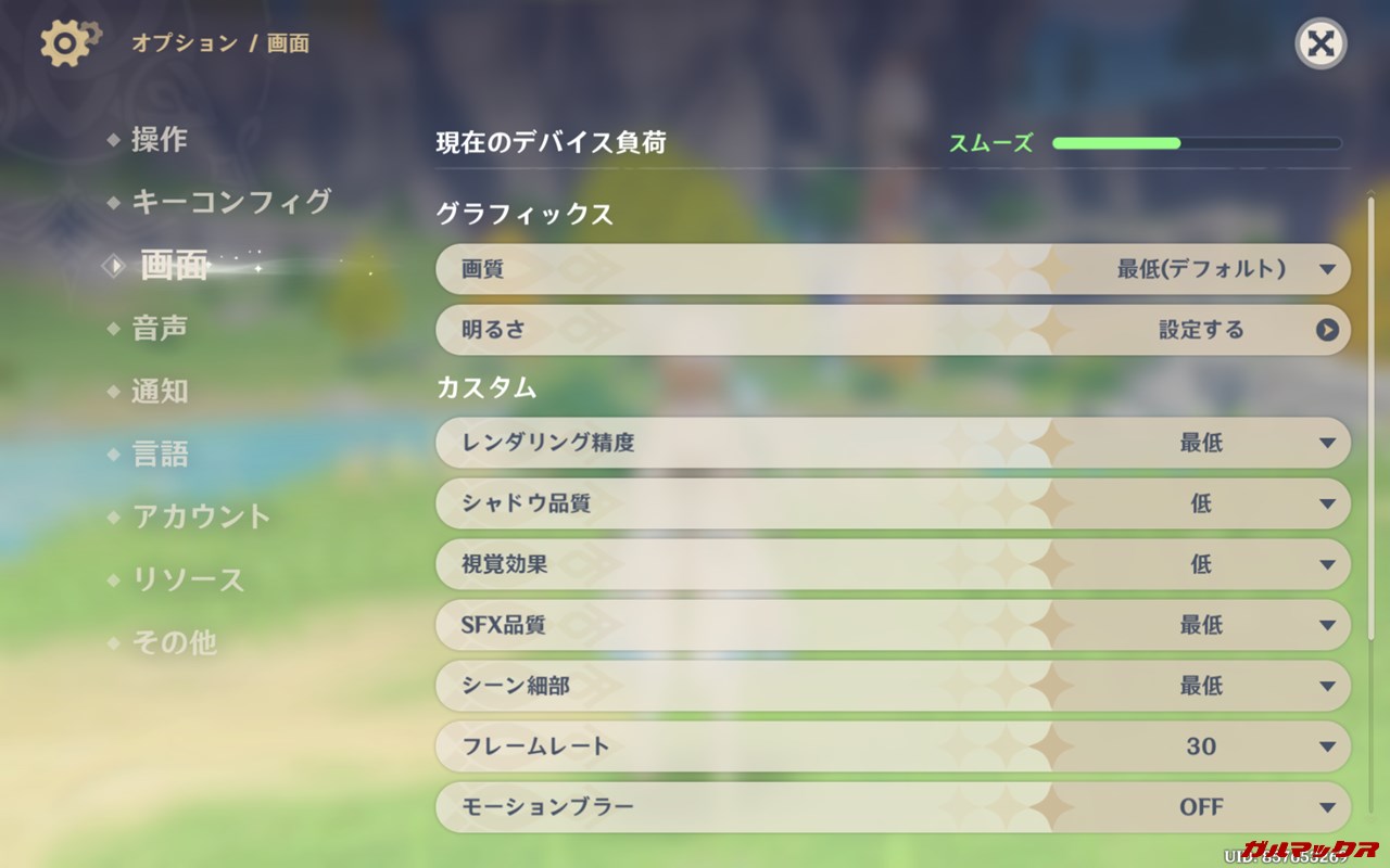 残念ながら下限30FPSは維持できず。また、デフォルトの画質設定が「最低」なので、これ以上負荷を軽くすることも難しいです。また、原神では美しいグラフィックもウリの一つなので、個人的には画質「中」設定以上で遊びたいところ…!というわけで、ALLDOCUBE iPlay 50 mini NFEで原神のプレイは厳しいですね…。